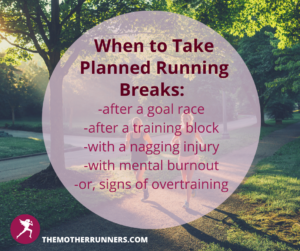 Most often, breaks from running occur at the end of a training cycle which usually culminates with a race. However, breaks can also occur at the end of a rigorous training block, with or without a race. This is called training periodization.