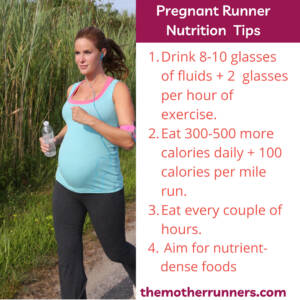 Fueling and hydrating are even more important when running while pregnant. Aim for about 30 grams of carbs and 12-20 ounces of fluids (at least, depending on the weather and your sweat rate) every half hour. (See specific hydration tips below)
